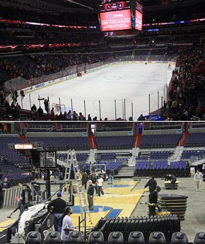 很多NBA場館也肩負著冰球館的作用,比如奇才主場Verizon中心也是老板旗下的冰球隊首都隊的主場,那么籃球館如何變成冰球館或者冰球館又是如何變成籃球館的呢?……