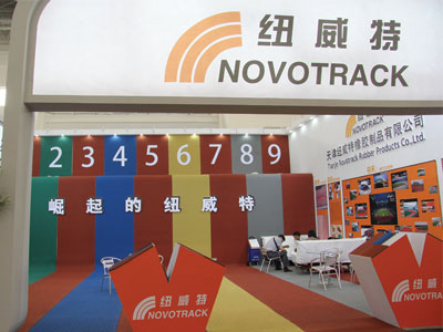 天津紐威特的展位上,一座由9條彩色塑膠組成的田徑跑道從腳下一直延伸到了展位上方,崛起的紐威特則成為展位上最醒目的一行大字。 在展位上,天津紐威……