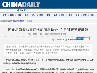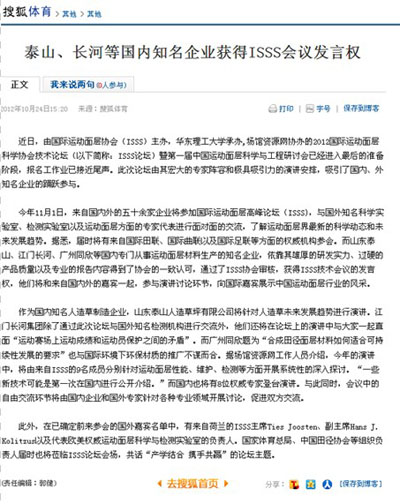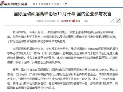 在報道2012國際運動面層科學協會技術論壇(以下簡稱ISSS論壇)過程中,新浪體育關注國內廠商參會情況,并對廠商在會上的演講進行了報道。希望通過廠家在國際論壇上發出聲音……