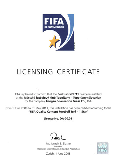 江蘇共創人造草坪有限公司獲FIFA 1星場地認證證書 近日,由江蘇共創人造草坪有限公司生產的貝特®(BESTTURT®)YEII系列人造草坪在斯洛伐克鋪設的MFK Topolčany俱樂部場地,通過了……