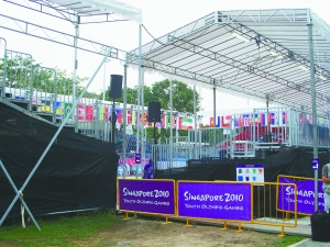 網球場臨時搭建的看臺 帳篷板房搭建“臨時體育館” 白色帳篷組成的功能區、深藍色的活動板房……新加坡青奧會的競賽場館大都能看到這樣的臨時……