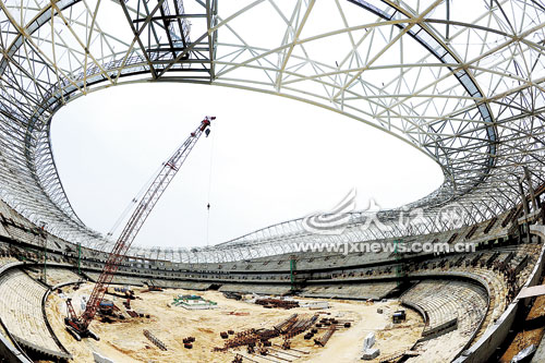 8日,記者在南昌國際體育中心體育場拍攝到其外部和內部雄姿。南昌國際體育中心體育場鋼結構工程已全部完成,外部形狀頗似“鳥巢”。據了解,體育場目前正在進行鋼結構……