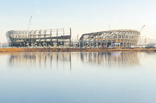 10日,位于達道灣工業區南側、依水而建的鞍山市體育中心主體育場在藍天碧水的映襯下氣勢宏偉。目前,體育場正在進行頂棚鋼梁的焊接,工程進展順利。 ……