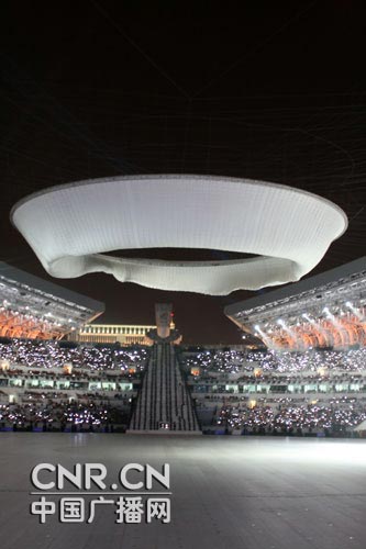 濟南奧體中心體育場流光溢彩(中廣網記者楊曉凡攝) 中廣網北京10月17日消息(記者柴安東)據中國之聲《央廣新聞》17時12分報道,一提起十一運會的主辦城市濟南,人們會想起那句“四面荷……