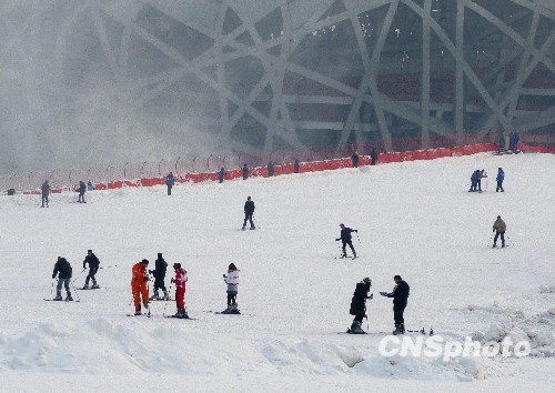 “鳥巢”10米高臺開放 2009年12月28日,北京,“鳥巢”北側熱身場上的10米高臺滑雪坡道正式開放,眾多滑雪愛好者歡聚在這里馳騁娛樂。至此,經過全方位調測試,鳥巢歡樂冰雪季正式全面開……