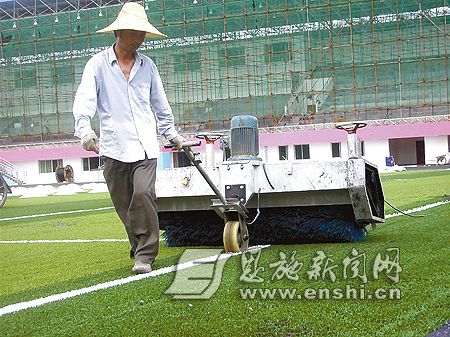 7月7日,恩施民族體育場改造工程工地上,工人正在施工。與此同時,場內跑道鋪設和觀眾席座位安裝也正如火如荼地進行。恩施民族體育場是州六運會的主場館。目前,場館改造工程已經完成……