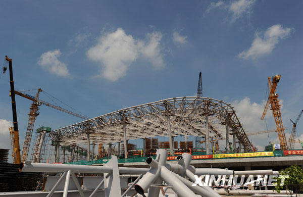 圖為建設(shè)中的廣州亞運(yùn)城綜合體育館。(7月7日攝) 廣州亞運(yùn)城的標(biāo)志性建筑綜合體育館目前已進(jìn)入鋼結(jié)構(gòu)吊裝施工階段。該工程將于明年3月底竣工。 圖為建設(shè)中的廣州亞運(yùn)……