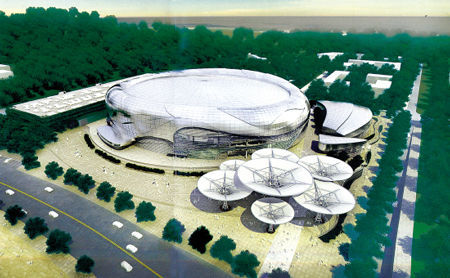 ●演藝中心主體建筑在外形上和“鳥巢”也很相似,不過比鳥巢多了一個“蓋子”,為全封閉式。 ●場館除了占地6.5萬平方米、1.8萬個坐席的球館之外,還設有各類運動練習館,附設!
