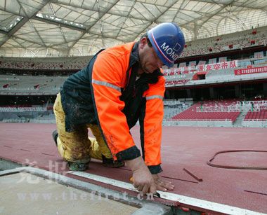 經過11天的緊張施工,昨天,國家體育場“鳥巢”1.4萬平方米的塑膠跑道鋪設工作全部完成,4月15日前跑道線將全部畫完。 新型跑道首進北京場館 據北京城建集團國家體育場工程總承包部……
