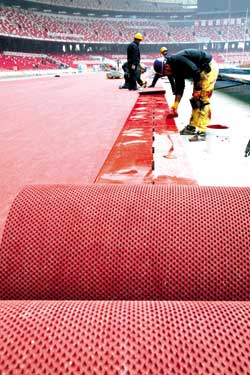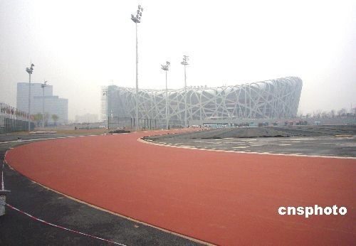 “鳥(niǎo)巢”熱身場(chǎng)地塑膠跑道鋪設(shè)完畢
