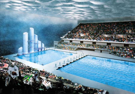 水立方室內(nèi)效果圖 中方設(shè)計(jì)師之一王敏 今天,當(dāng)人們對(duì)著快要建成的鳥巢和水立方發(fā)出異于當(dāng)年的嘖嘖之聲時(shí),到底是建筑師走得太遠(yuǎn),還是大眾接受新事物需要時(shí)間,似乎變成一個(gè)虛弱的問……