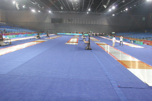 寬闊的擊劍競(jìng)賽場(chǎng)地 第29屆奧運(yùn)會(huì)官方網(wǎng)站9月13日訊 坐落在國(guó)家會(huì)議中心內(nèi)的擊劍館目前已經(jīng)完成各項(xiàng)準(zhǔn)備工作,將于9月15日迎來(lái)“好運(yùn)北京”現(xiàn)代五項(xiàng)世界杯總決賽中的擊劍和射擊(十米氣……
