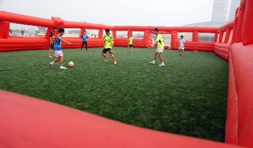 9月16日,人們在可移動式足球場進行業(yè)余五人制足球賽。近日,一種由氣模、人造草皮制作的可移動式足球場亮相天津銀河廣場。據(jù)介紹,這種足球場除能移動外,還具有安全性高……