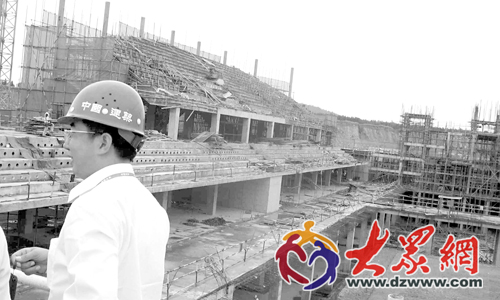 據介紹,游泳館投入使用后將采用石英砂過濾的方式進行水凈化,游泳池還將安裝先進的水下救生系統 奧體中心游泳館主體工程順利封頂。(胡永慶 攝) 今天上午,奧體中……