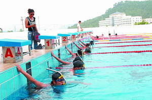 蹼泳運動員在一汪碧水中開展訓練 工程技術人員在調整跳板 工作人員細心觀測游泳池的水消毒數據 8月25日,剛剛通過驗收的玉林市體育中心游泳館提前投入訓練使用,……