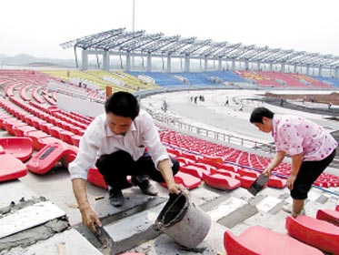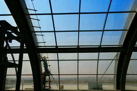 為了迎接2008奧運會,順義奧林匹克水上公園周邊環境建設已經初具規模。 工人在安裝主看臺背面的玻璃幕墻 走過靜水艇庫……