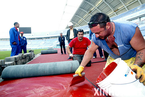 工作人員在鋪設塑膠跑道 5月29日,工作人員在沈陽奧體中心體育場鋪設塑膠跑道。 當日,作為2008年奧運會分賽場之一的沈陽奧……