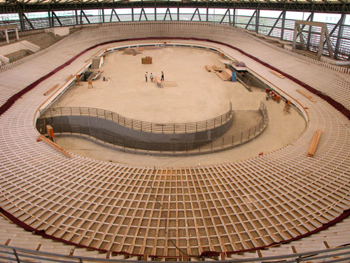 該賽道是一座橢圓形盆裝建筑物,賽道長度(測量線)250.006米,道面寬度8米,南北長軸方向長約140米,東西短軸方向長約80米,直道長度35.260米,直道最小坡度13度,彎道最大彎度45度,設計最高時速85公里/小時。賽道主體結構為全木質結構,賽道表面呈空間連續變曲面。